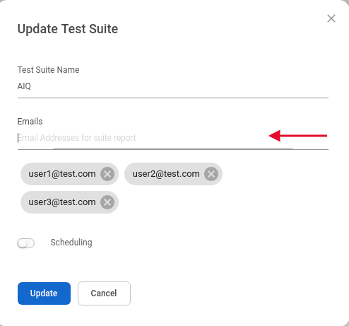 User can now add multiple email to a suite for receiving consolidated report after the suite execution. Enter valid email and by press tab,comma or enter key multiple emails can be added.